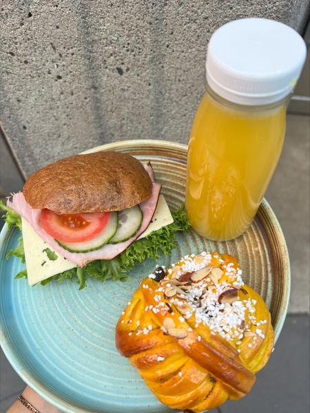 Bagarens frukost VEGAN Ljus fralla med hummus & tomat, apelsinjuice samt vegansk bulle (dagens variant). ![]() |