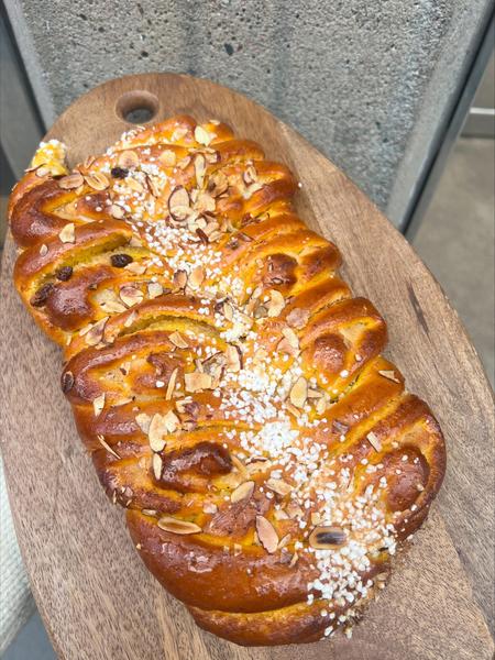 Saffranslängd Gyllene saffranslängd med mandelmassa och russin. Pärlsocker och mandelspån på toppen. ![]() ![]() ![]() ![]() |